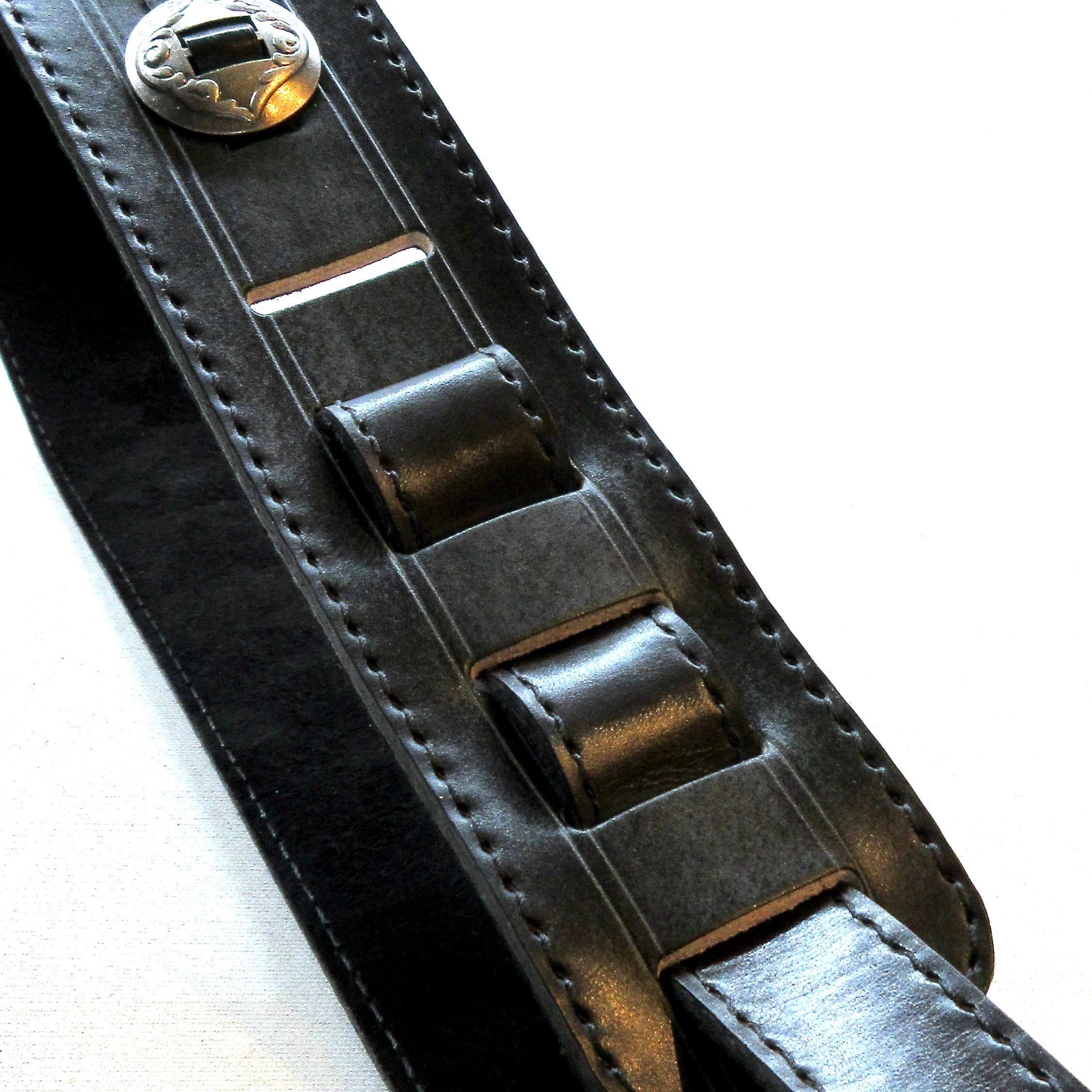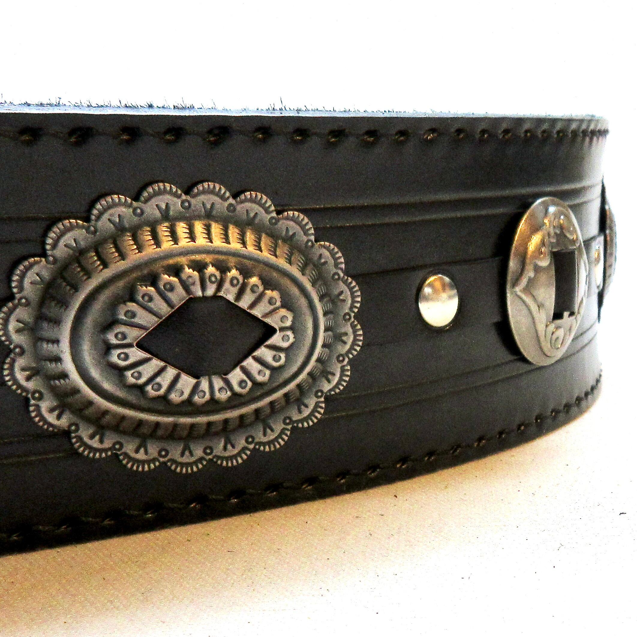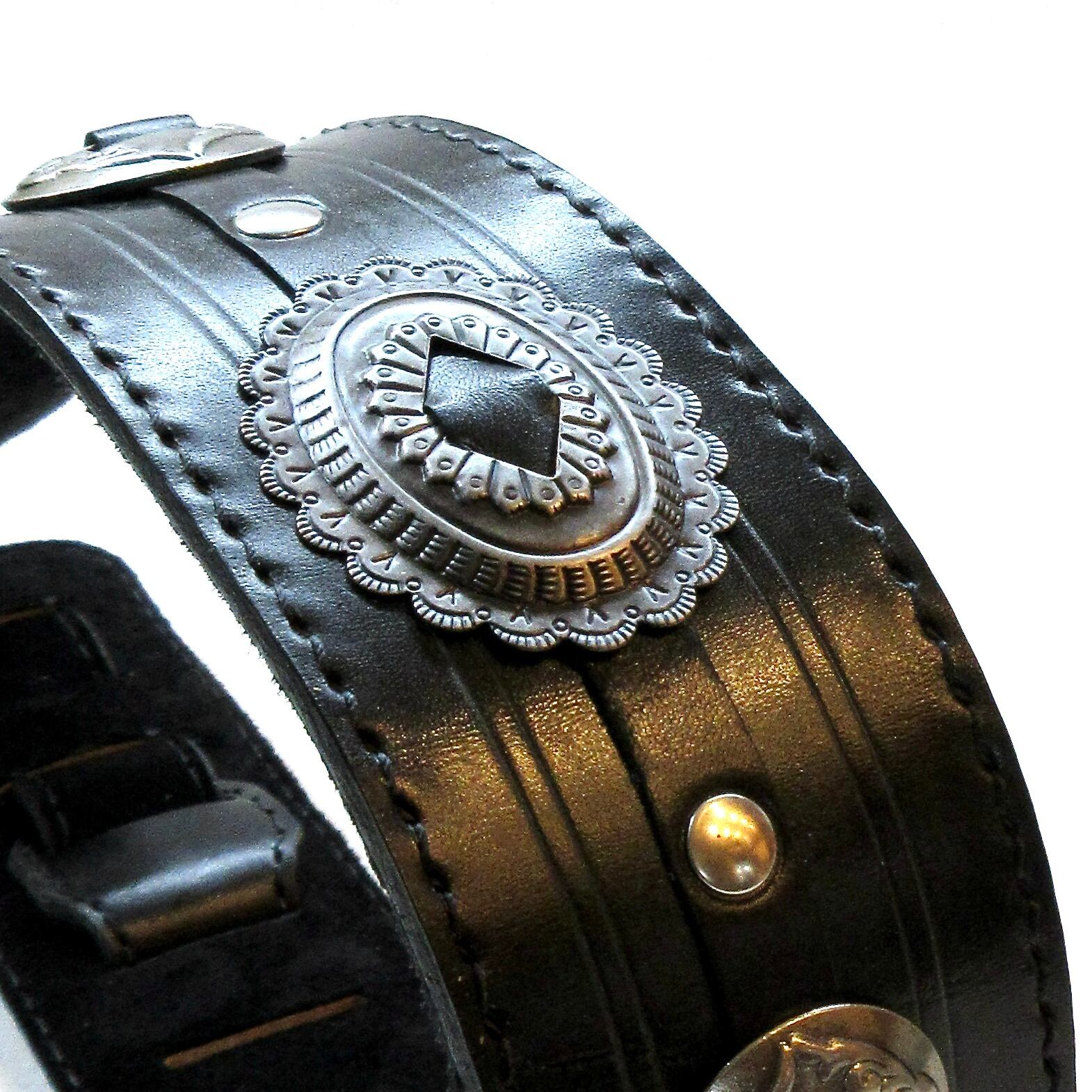 艶を抑えて鈍く光るシルバーのコンチョは、ブラック・レザーと最高の相性を演出します!