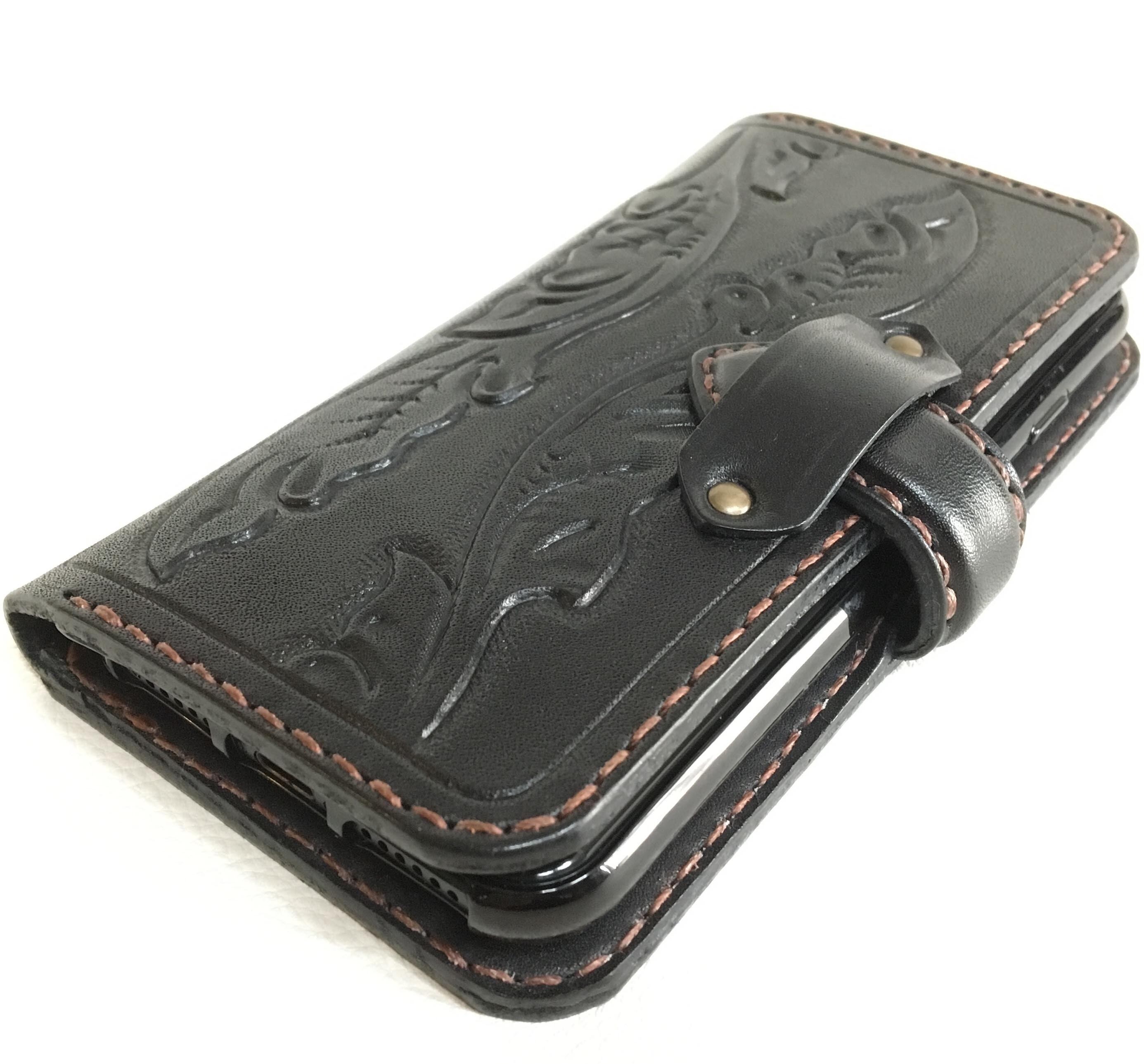 本革製iPhone7ホルダー(黒革 カービング)mh019