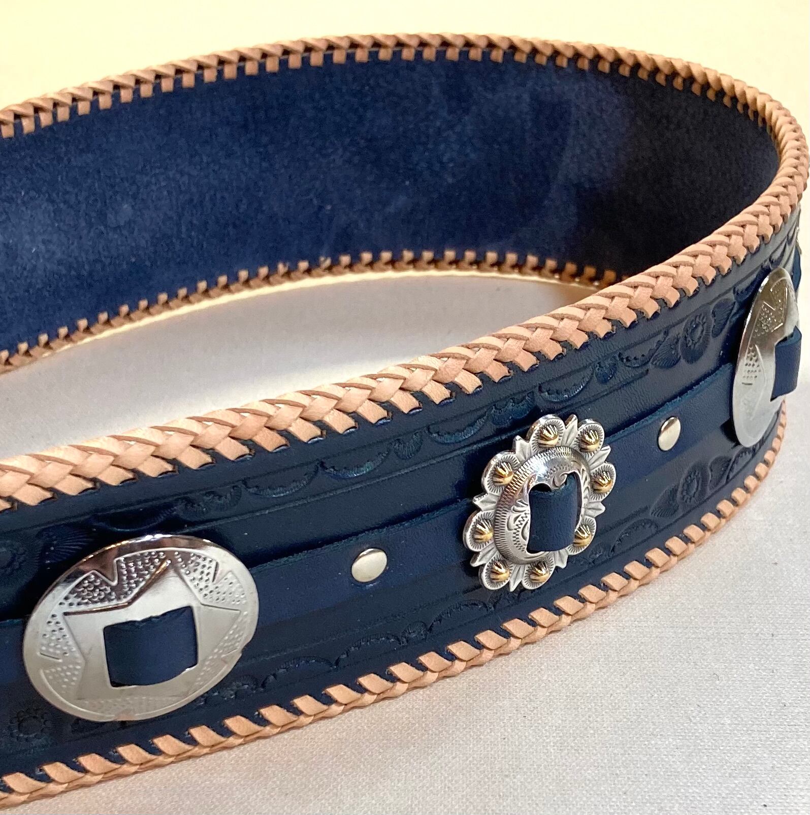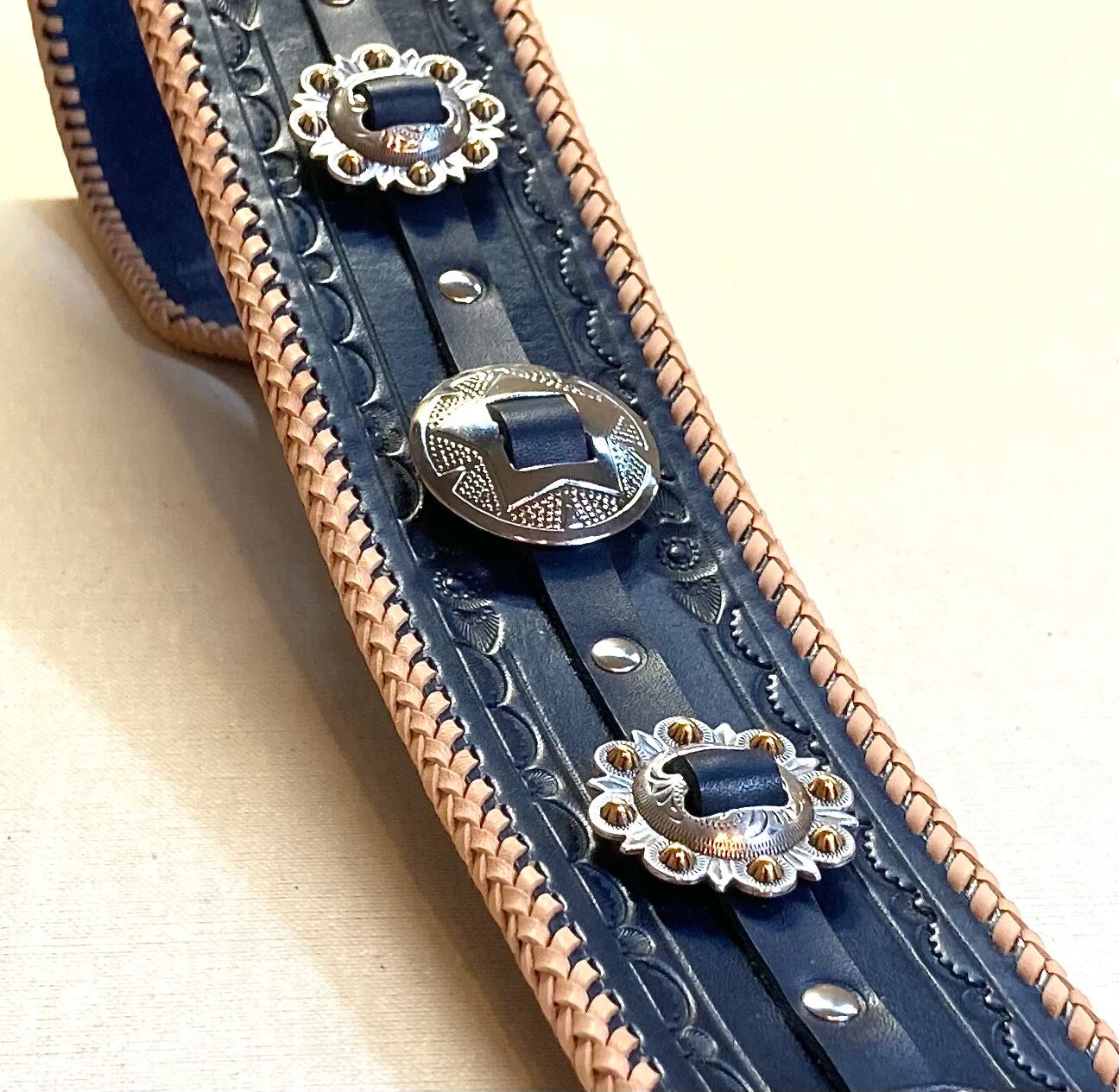 8個のコンチョを配置し、18メートルもの長さの革レースを縁に丁寧に編み込みました。