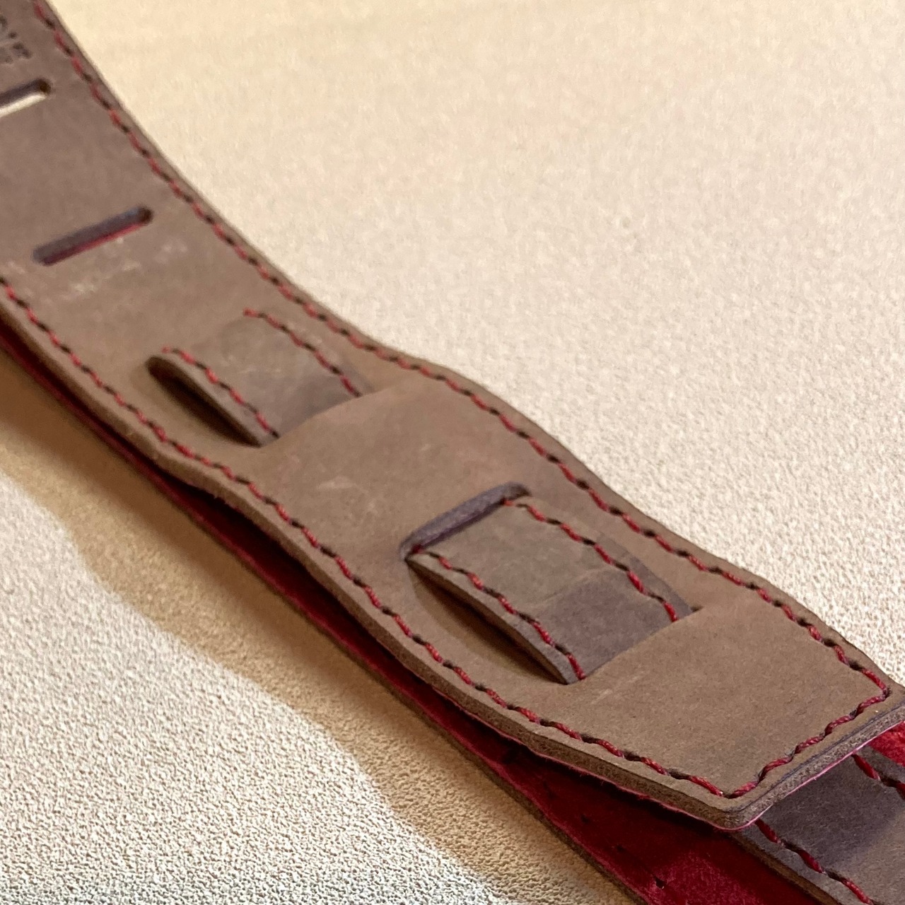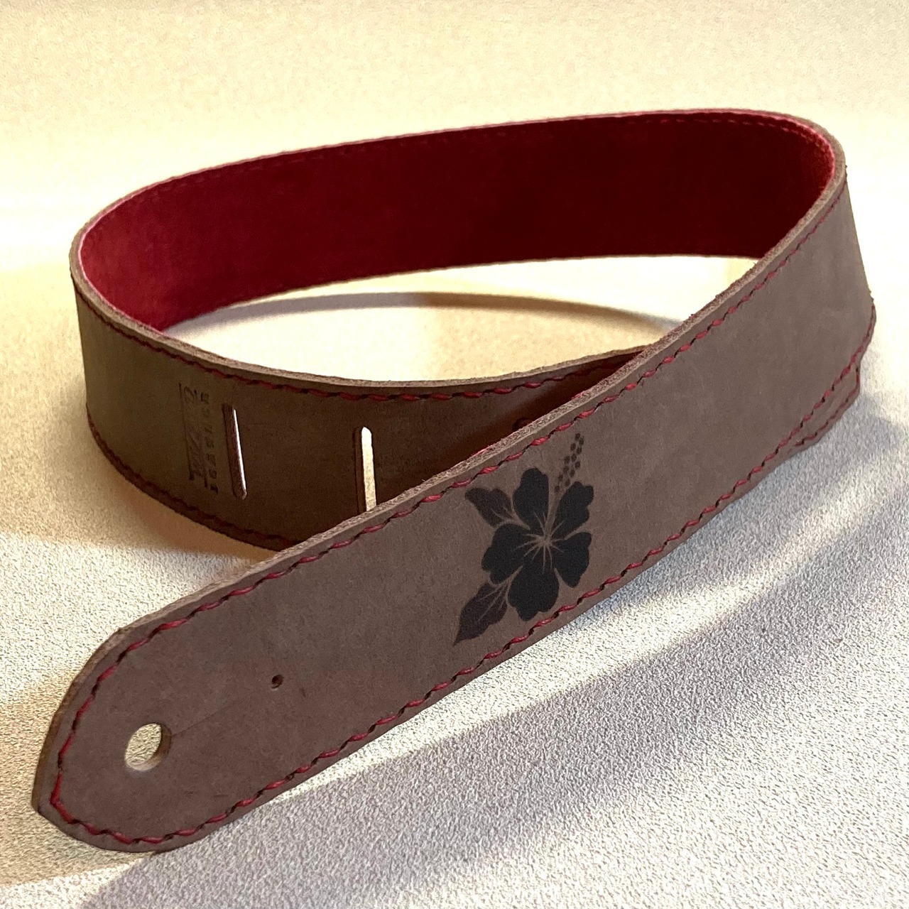 手縫いの本革製ウクレレ用ストラップ。